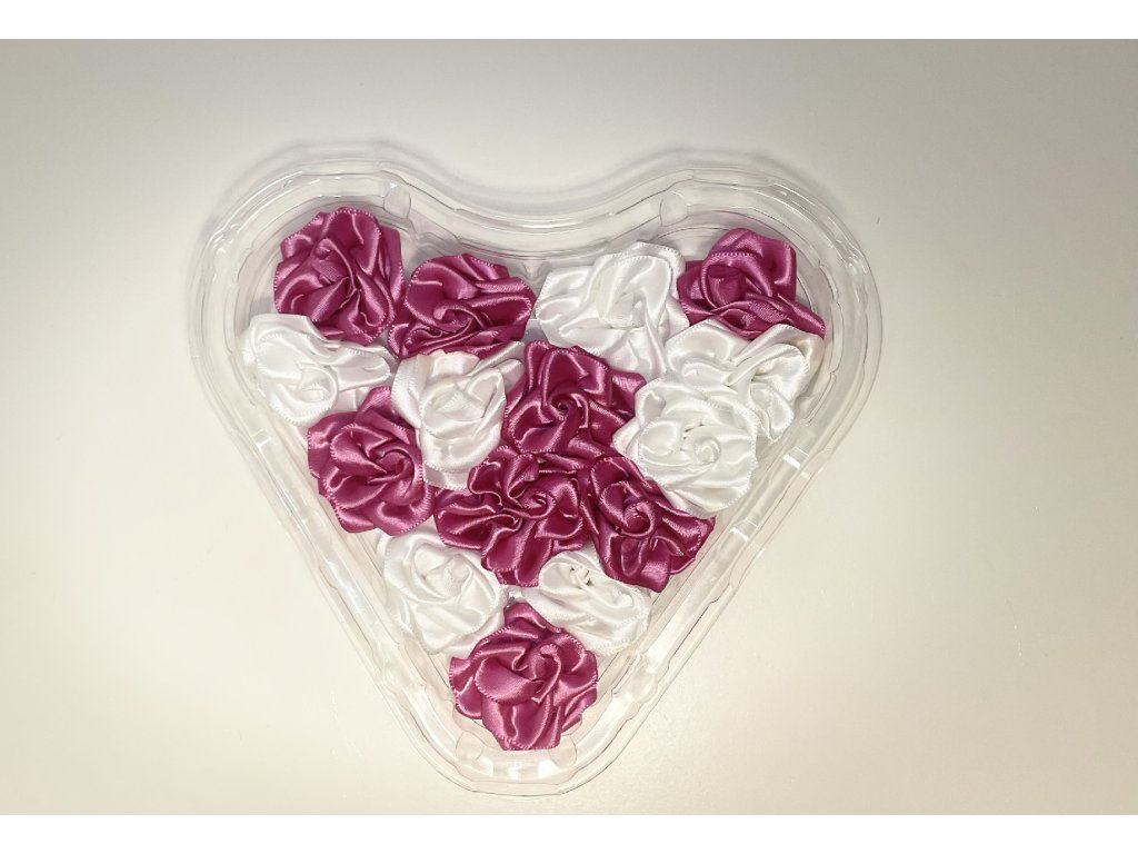 Srdcová krabička je pečlivě vyplněna patnácti saténovými květy v různých barevných kombinacích. Každý z nich skrývá na spodní straně slova vyjadřující lásku.