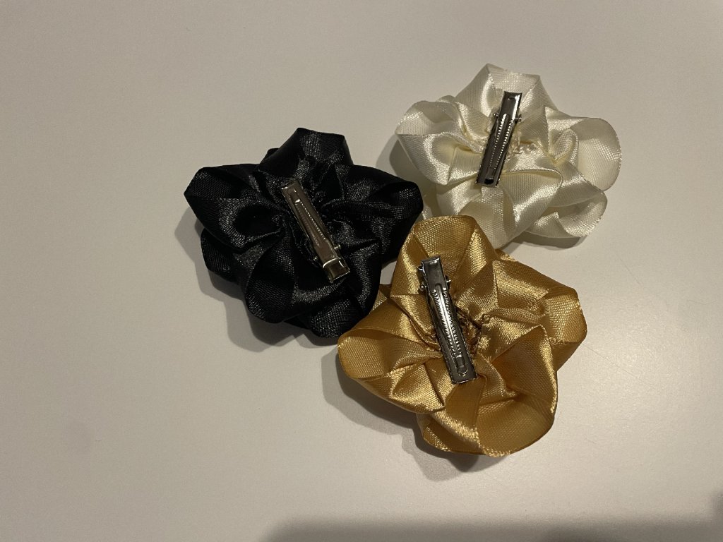 Sponka do vlasů se saténovou růží The fairy. Každá má lehce odlišný vzhled, ale všechny spojuje stejná kvalita a pečlivost výroby.